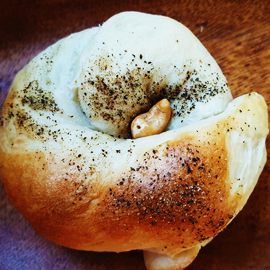 北海道産強力粉、天然酵母、石垣の塩、水、で作り上げた生地に、ブラックペッパー、カシューナッツを成形時に巻き込んでいます。