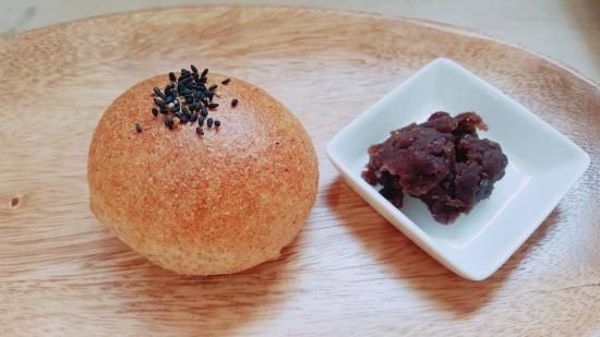 北海道産強力粉、天然酵母、石垣の塩、水、で作り上げた生地に、北海道産小豆を沖縄県産の純黒糖で炊いた手作り粒あんを包みました。