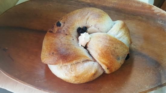 北海道産強力粉、天然酵母、石垣の塩、水、にドライブルーベリーを生地に練りこみ、クリームチーズとドライブルーベリーを成形時に巻き込んでいます。お一人様2個まで