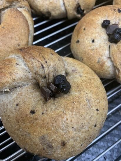 北海道産全粒強力粉、天然酵母、石垣の塩、水、にドライブルーベリーを生地に練りこみ、さらにブルーベリーとビターチョコを成形時に巻き込んでいます。